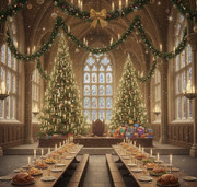 Die sonst schon beeindruckende Große Halle wird in dieser Zeit zu einem atemberaubenden Anblick. Hohe Tannenbäume, geschmückt mit Hunderten von echten Kerzen, die frei in der Luft schweben, erleuchten den Raum mit einem warmen, goldenen Schein. Dicke Girlanden aus Stechpalmen und Efeu winden sich um die steinernen Säulen, und glitzernde, verzauberte Weihnachtskugeln baumeln von den Deckenbalken.